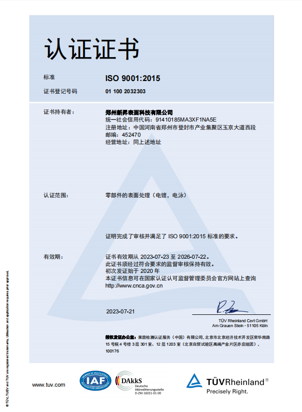 2023年7月取得德國(guó)萊茵TÜV頒發(fā)的IATF 16949:2016質(zhì)量體系認(rèn)證證書